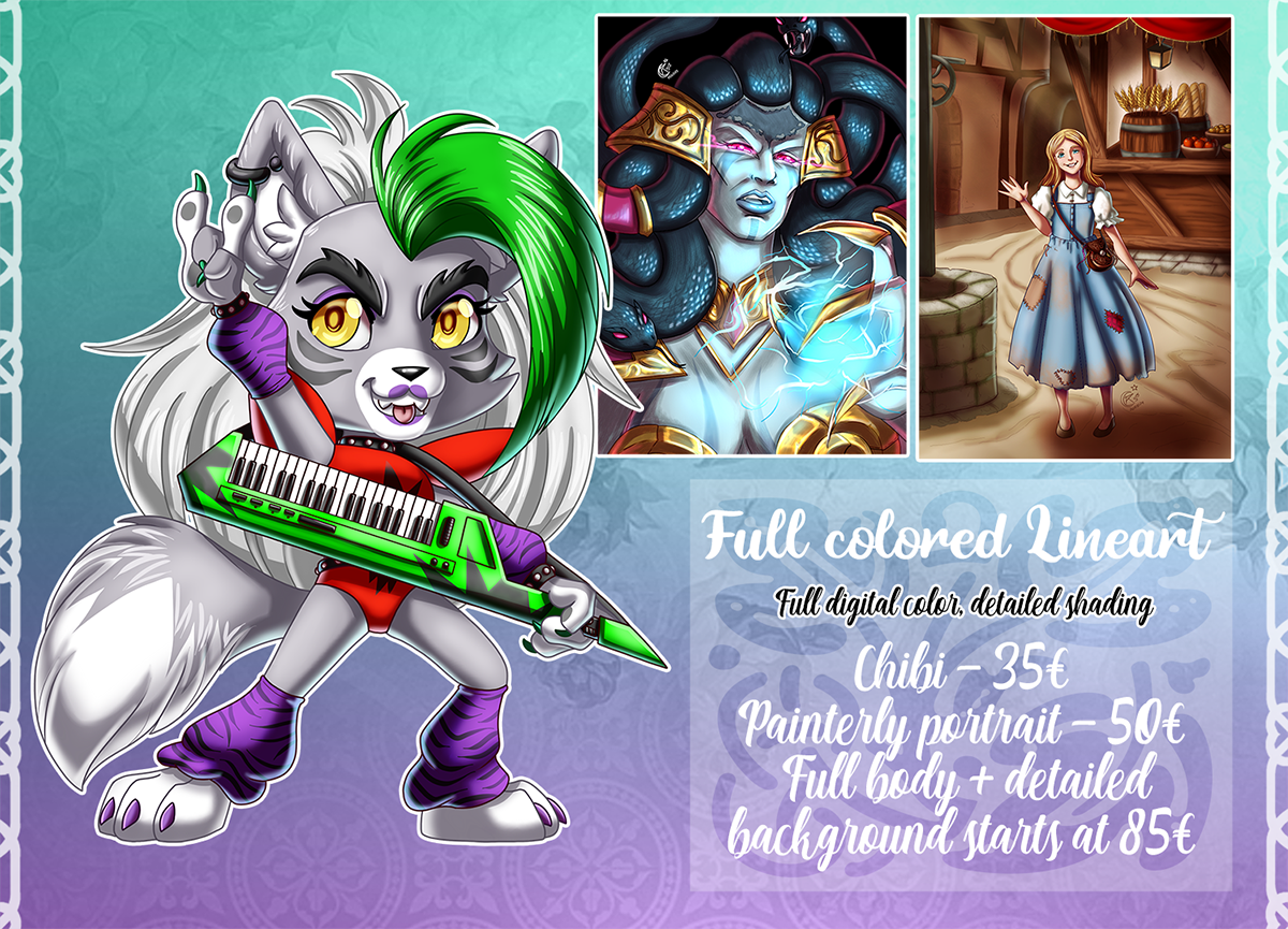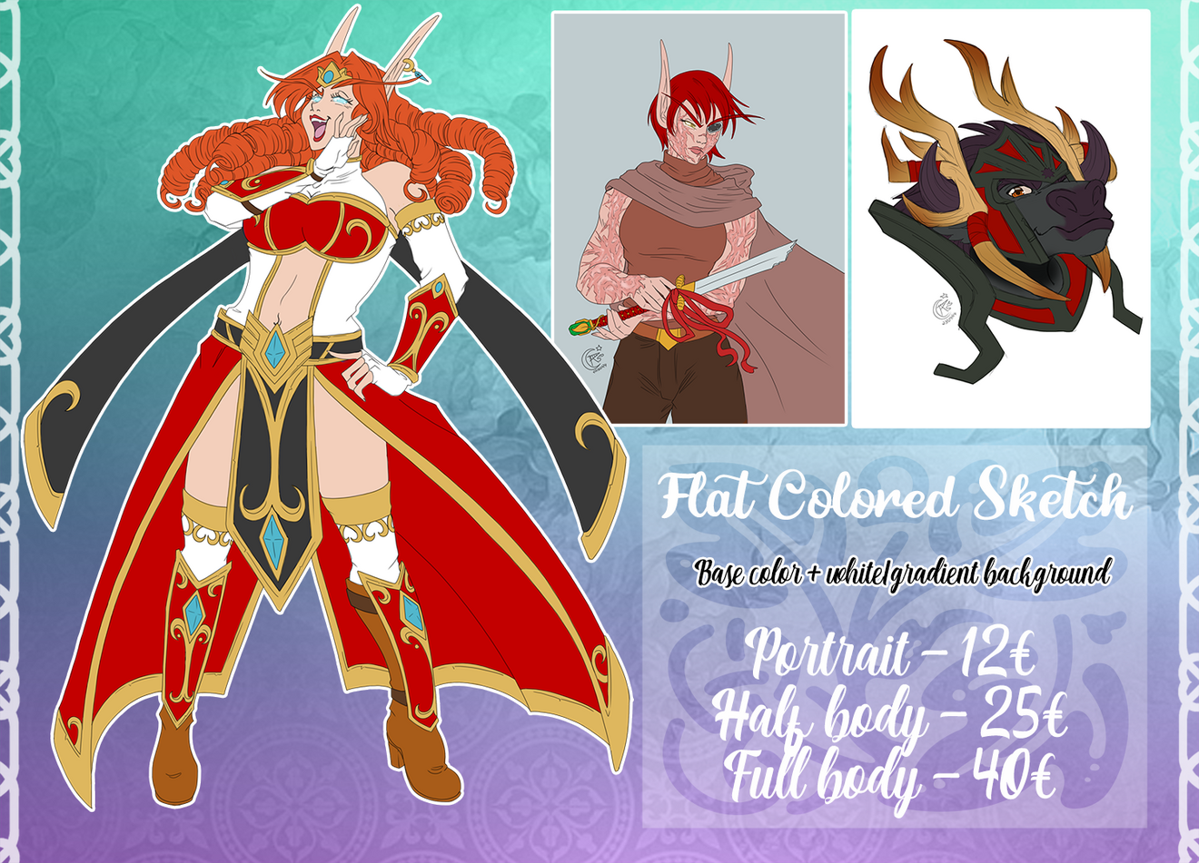Additions/special requests not specifically listed might increase the price (Big Weapons, Wings, detailed outfit/armour, pets/companions, ...)